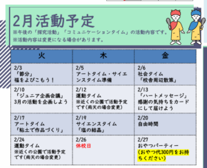 ●2026-02-07 | ニュース2月活動のお知らせ Home お知らせ一覧 お知らせ 2月活動のお知らせ 2月活動のお知らせ 寒さは続きますが、2月も元気に活動中!⛄ 今月は ●サイエンスタイム/塩の結晶作り ●アートタイム/粘土で作品を作ろう ●感謝カードを作ろう💕 その他、体を動かす活動やおやつパーティ―など楽しい企画もたくさん🍩✨ 体験も随時受け付けております! 御気軽にお問い合わせください(^^)/ BACK一覧へ戻るNEXT